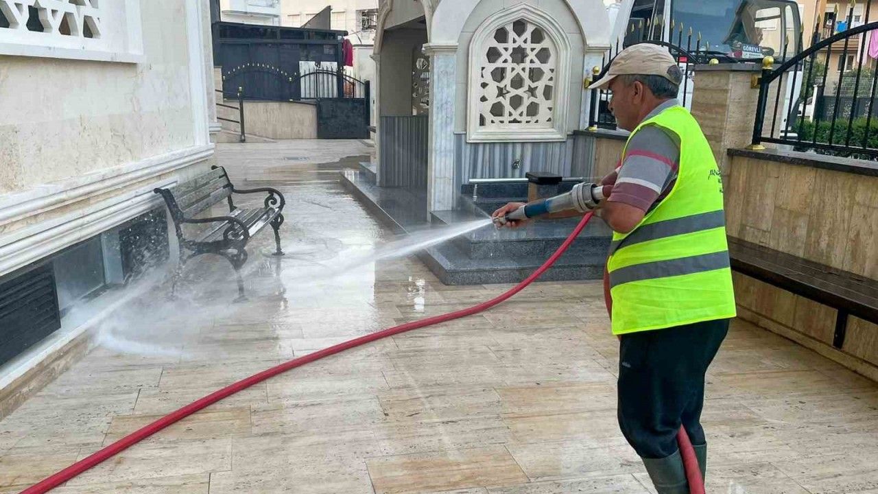 Caminin iç ve dış mekanlarında gerçekleştirilen temizlik çalışmaları kapsamında cami avluları ve abdesthaneler temizleniyor; mihrap, minber ve kürsü gibi alanlar dezenfekte ediliyor.