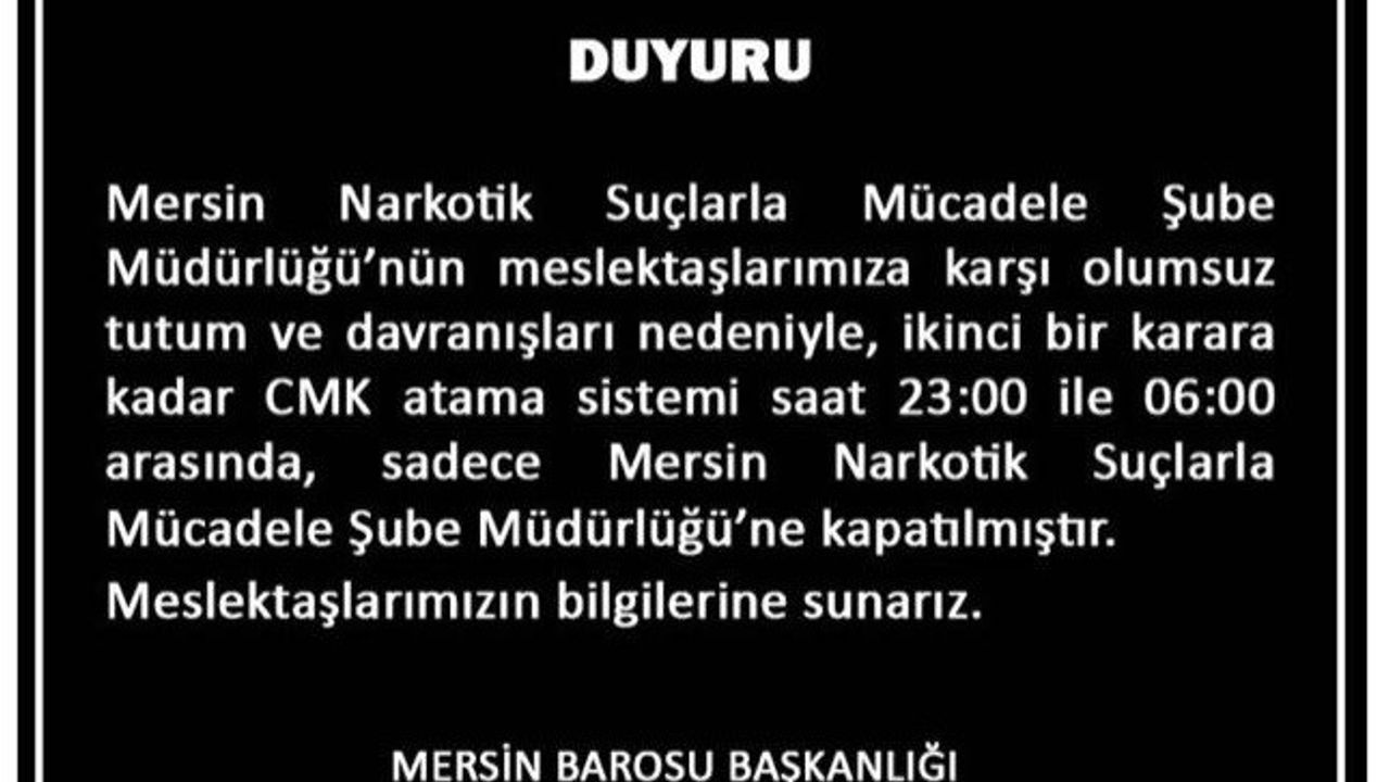 Mersin Barosu, İl Emniyet Müdürlüğü Narkotik Suçlarla Mücadele Şubesi’ne geceleri avukat atamayı durduran bir açıklama yayımladı.