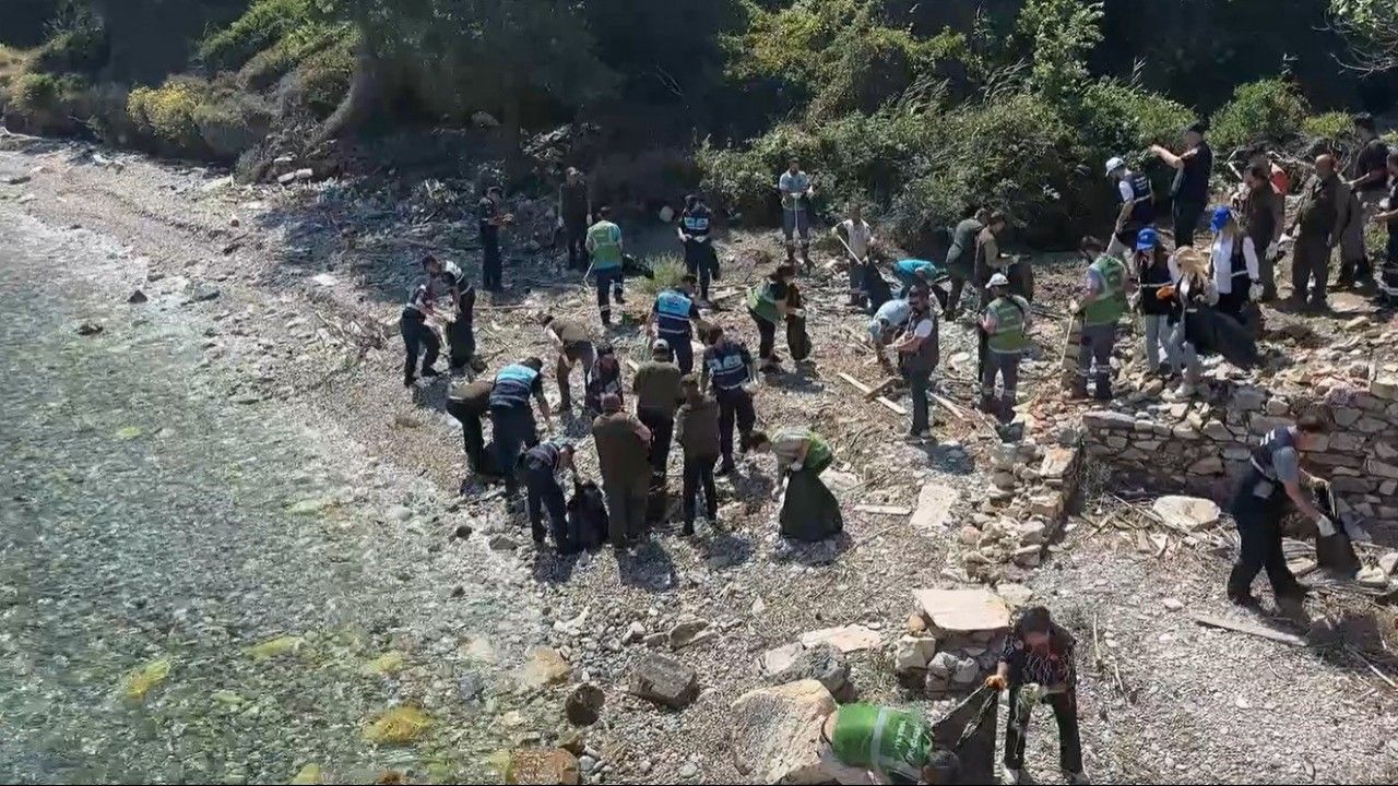 Aydın’ın Kuşadası ilçesinde bulunan Milli Park’ta kıyı temizliği gerçekleştirilirken, koyların temizlendiği çalışmalar sonunda 4 römork atık toplandı.