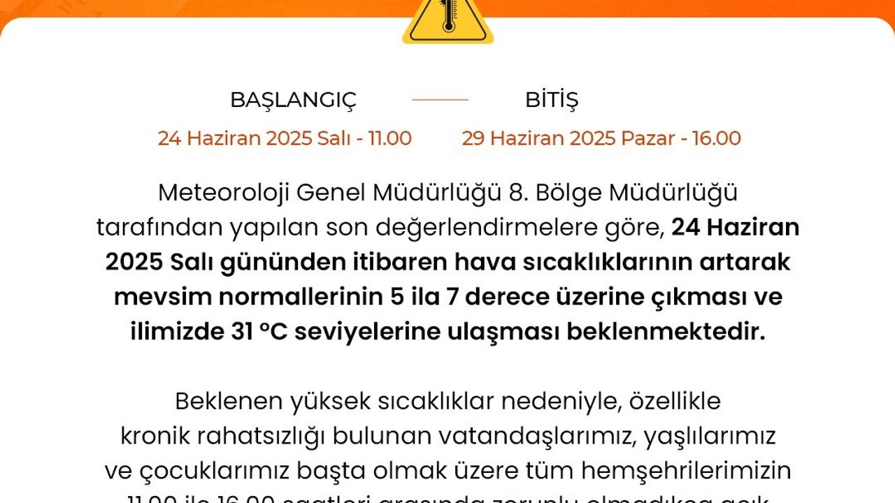 Meteoroloji Genel Müdürlüğü 8. Bölge Müdürlüğü’nün son değerlendirmelerine göre; 24 Haziran 2025 Salı günü saat 11.00 itibariyle başlayacak olan sıcak hava dalgası, 27 Haziran 2025 Pazar günü saat 16.00’ya kadar etkili olacak. Yapılan açıklamada; hava sıcaklıklarının mevsim normallerinin 5 ila 7 derece üzerine çıkarak il genelinde 31 C seviyelerine ulaşmasının beklendiği belirtildi. Niğde Valiliği tarafından yapılan duyuruda; özellikle kronik rahatsızlığı bulunan vatandaşlar, yaşlılar ve çocukların bu süreçte dikkatli olmaları istendi. Valilik; 11.00 ile 16.00 saatleri arasında zorunlu olmadıkça açık alanda bulunulmaması gerektiğini vurgulayarak, güneş çarpmasına karşı gerekli tedbirlerin alınması çağrısında bulundu.