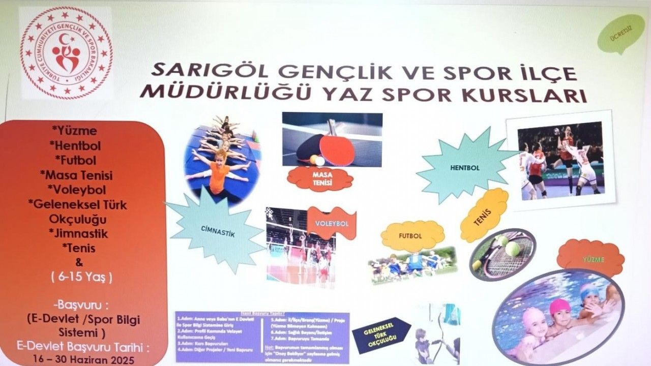 Sarıgöl Gençlik ve Spor İlçe Müdürü Gökhan Yıldırım yaptığı açıklamada, "Sarıgöl Gençlik ve Spor İlçe Müdürlüğü olarak, yaz boyunca düzenleyeceğimiz hentbol, voleybol, yüzme, cimnastik, tenis, masa tenisi, geleneksel Türk okçuluğu ve futbol kurslarına tüm çocuk ve gençlerimizi davet ediyoruz" dedi.