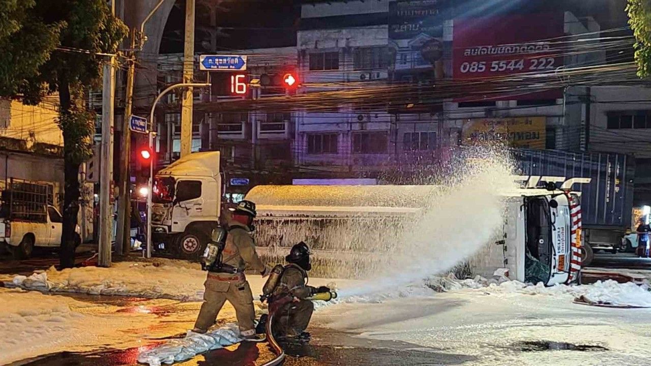 Tayland’ın başkenti Bangkok’ta dün gece saatlerinde konteyner yüklü bir tır ile akaryakıt tankerinin çarpışması sonucu meydana gelen kazada, yaklaşık 600 litre benzin yola döküldü.